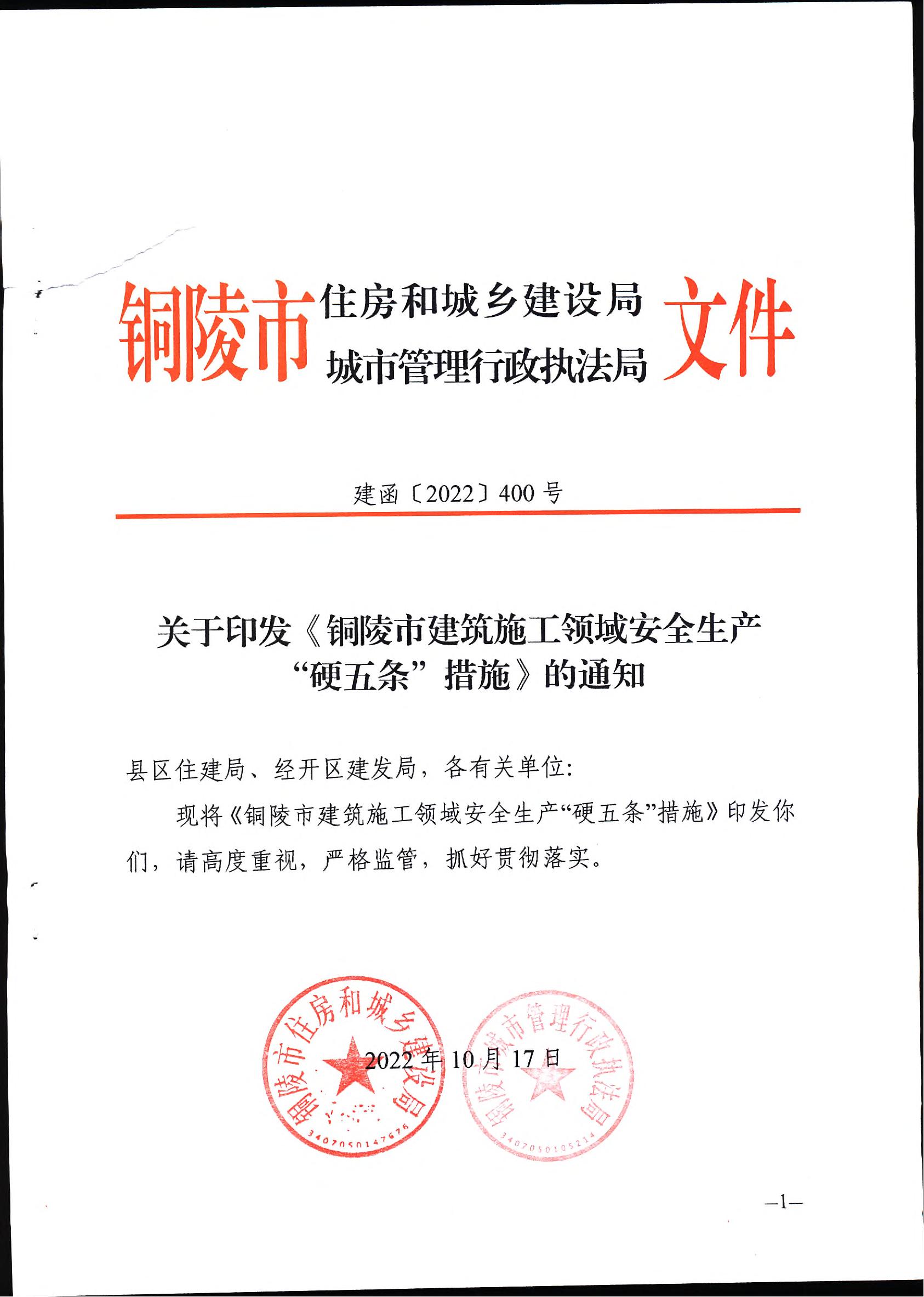 关于印发《铜陵市建筑施工领域安全生产“硬五条”措施》的通知